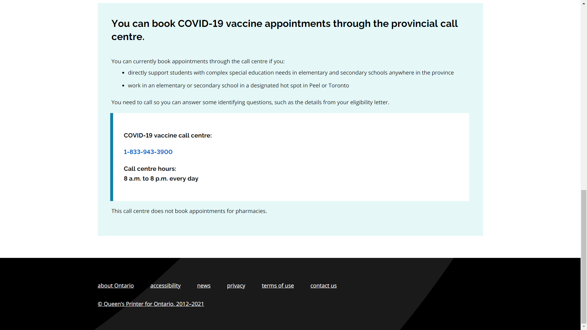 4. Press the "Start" button and then to be directed to the section of "You can book COVID-19 vaccine appointments through the provincial call centre".